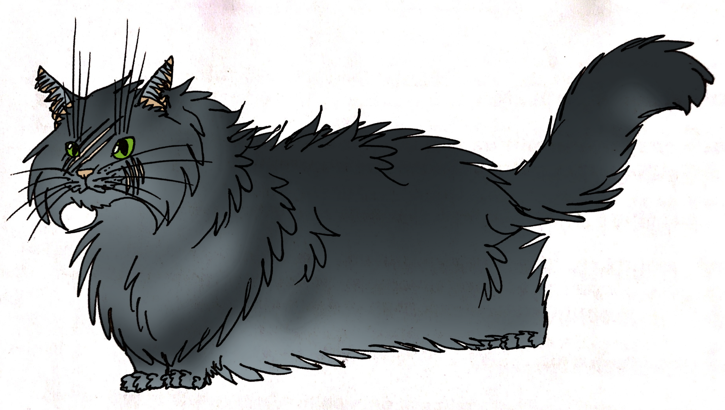Длинная и растрёпанная дымчато-серая шерсть скрывает его телосложение и множество шрамов, в результате чего видны только следы когтей на его морде. Большие круглые зелёные глаза.